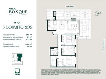 Últimas 2 unidades disponibles en Grou Bosque ! living comedor con enorme terraza con vista super despejada, cocina equipada con Horno eléctrico, anafe y campana extractora, Muebles aéreos y bajo mesada. 3 dormitorios con placares, 2 baños , el principal es en suite, terraza lavadero - aire acondicionado en todos los ambientes - portería virtual con control de acceso, - 5100 m2 de jardín y area verde con amenities (Piscina, Solarium, Gimnasio, Co Work, Sum con parrillero, Laundry autoservicio mediante tarjeta o APP,y Área de juegos para niños, Parking para bicicletas) cocheras desde U$S 22.000 Gastos de ocupación de 5 % Beneficios de ley por vivienda promovida. Hay unidades disponibles en venta en construcción de 2 dormitorios desde U$S 210.000.= Consulte!
